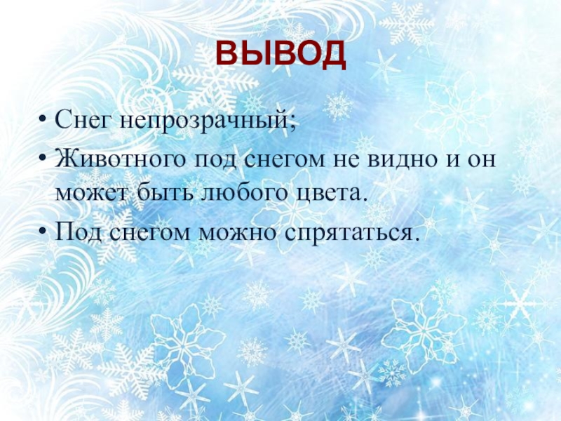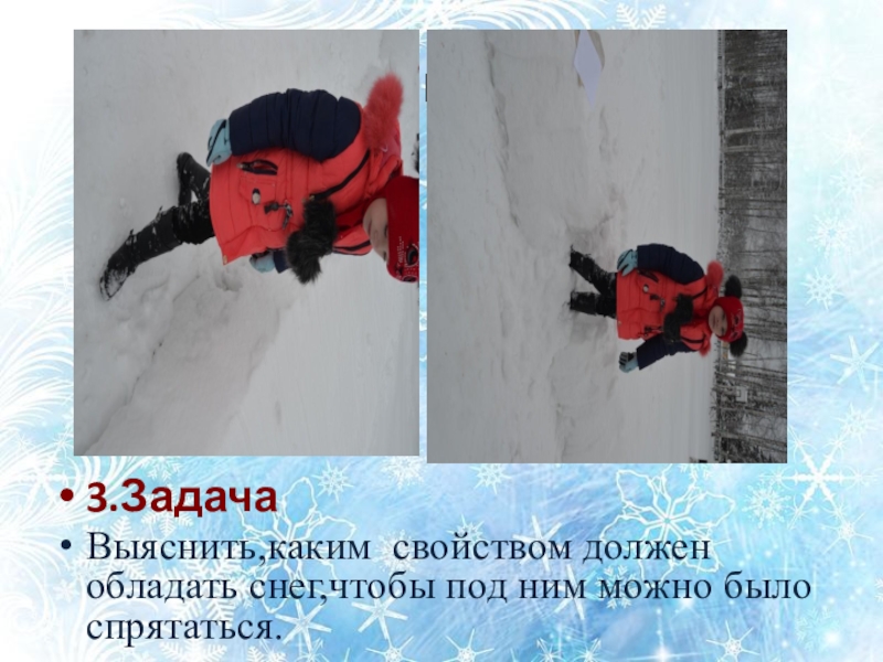 Выяснить,каким свойством должен обладать снег,чтобы под ним можно было спрятаться.