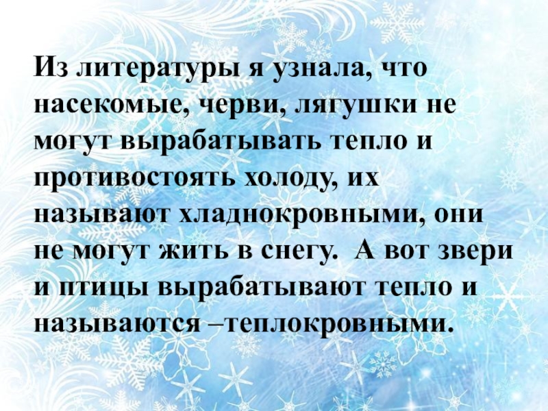 Слайд 16Из литературы я узнала, что насекомые, черви, лягушки не могут вырабатывать