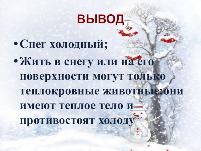 тепло и противостоять холоду, их называют хладнокровными, они не могут жить в снегу. А вот звери и птицы вырабатывают тепло и называются –теплокровными.