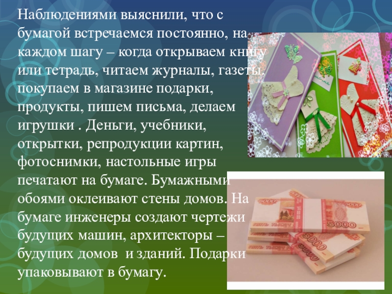 когда открываем книгу или тетрадь, читаем журналы, газеты, покупаем в магазине подарки, продукты, пишем письма, делаем игрушки . Деньги, учебники, открытки, репродукции картин, фотоснимки, настольные игры печатают на бумаге. Бумажными обоями оклеивают стены домов. На бумаге инженеры создают чертежи будущих машин, архитекторы – будущих домов и зданий. Подарки упаковывают в бумагу.