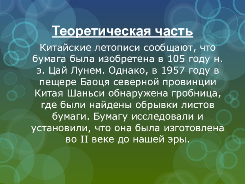 н.э. Цай Лунем. Однако, в 1957 году в пещере Баоця северной провинции Китая Шаньси обнаружена гробница, где были найдены обрывки листов бумаги. Бумагу исследовали и установили, что она была изготовлена во II веке до нашей эры.