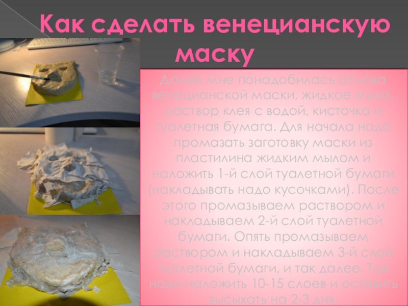 раствор клея с водой, кисточка и туалетная бумага. Для начала надо промазать заготовку маски из пластилина жидким мылом и наложить 1-й слой туалетной бумаги (накладывать надо кусочками). После этого промазываем раствором и накладываем 2-й слой туалетной бумаги. Опять промазываем раствором и накладываем 3-й слой туалетной бумаги, и так далее. Так надо наложить 10-15 слоев и оставить высыхать на 2-3 дня.