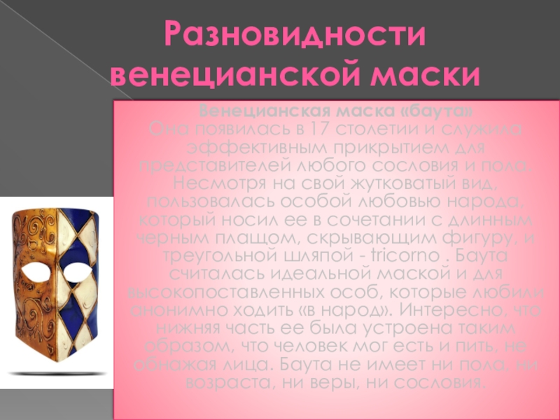 эффективным прикрытием для представителей любого сословия и пола. Несмотря на свой жутковатый вид, пользовалась особой любовью народа, который носил ее в сочетании с длинным черным плащом, скрывающим фигуру, и треугольной шляпой - tricorno . Баута считалась идеальной маской и для высокопоставленных особ, которые любили анонимно ходить «в народ». Интересно, что нижняя часть ее была устроена таким образом, что человек мог есть и пить, не обнажая лица. Баута не имеет ни пола, ни возраста, ни веры, ни сословия.