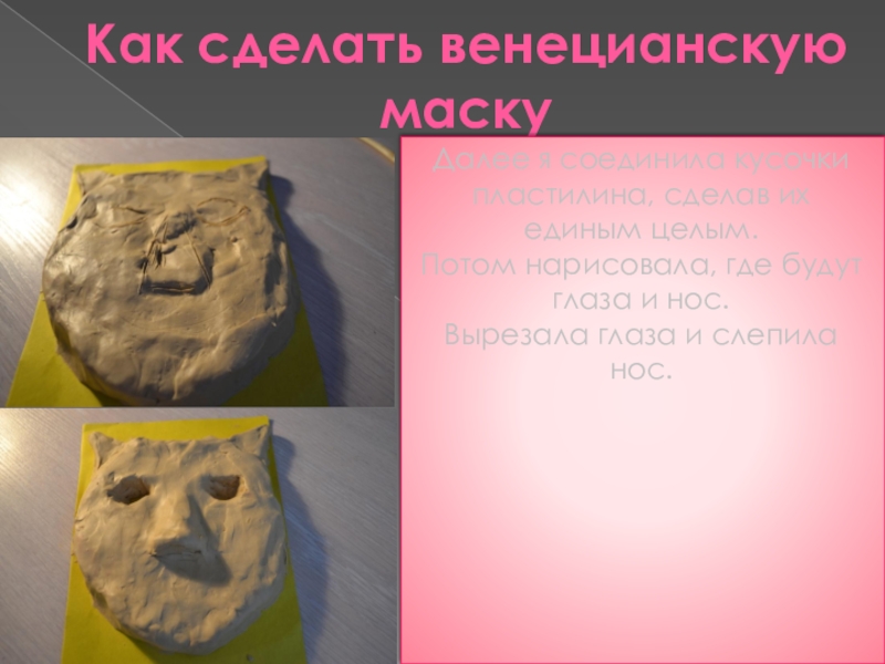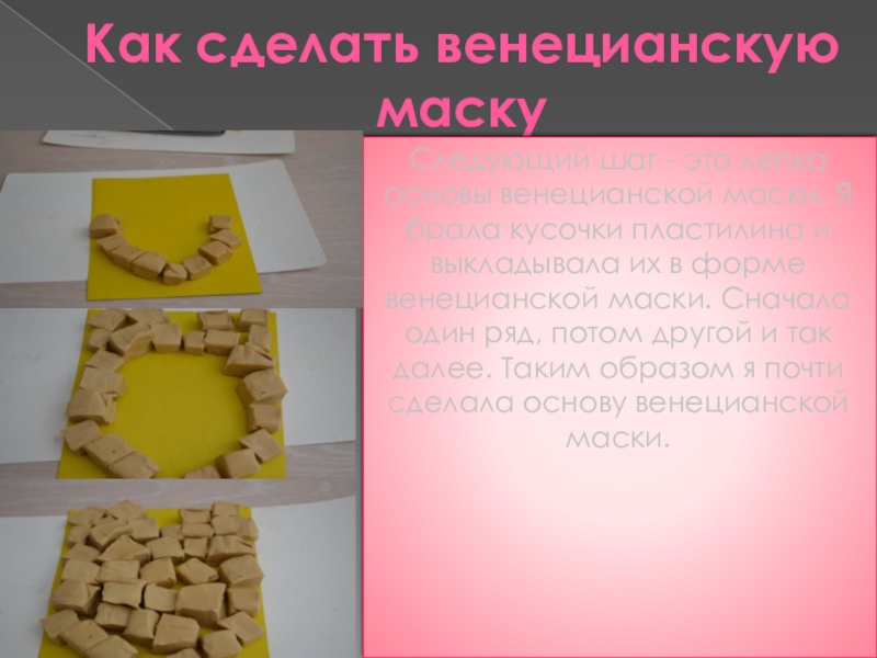 Я брала кусочки пластилина и выкладывала их в форме венецианской маски. Сначала один ряд, потом другой и так далее. Таким образом я почти сделала основу венецианской маски.