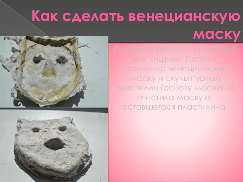 я разделила венецианскую маску и скульптурный пластилин (основу маски). И очистила маску от оставшегося пластилина.