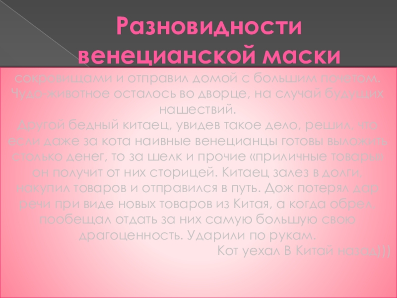 В ней рассказывается, как некий бедный китаец приехал в Венецию со своим старым котом. Кошек в городе не водилось, зато мышей было в переизбытке. Голодное животное набросилось на добычу и в несколько дней освободило островную республику от грызунов. Дож настолько обрадовался, что одарил китайца несметными