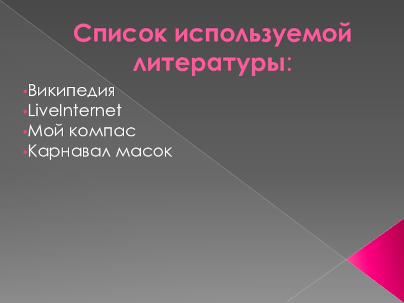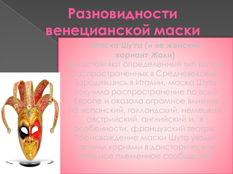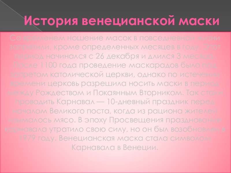 определенных месяцев в году. Этот период начинался с 26 декабря и длился 3 месяца. После 1100 года проведение маскарадов было под запретом католической церкви, однако по истечении времени церковь разрешила носить маски в период между Рождеством и Покаянным Вторником. Так стали проводить Карнавал — 10-дневный праздник перед началом Великого поста, когда из рациона жителей изымалось мясо. В эпоху Просвещения празднование карнавала утратило свою силу, но он был возобновлен в 1979 году. Венецианская маска стала символом Карнавала в Венеции.