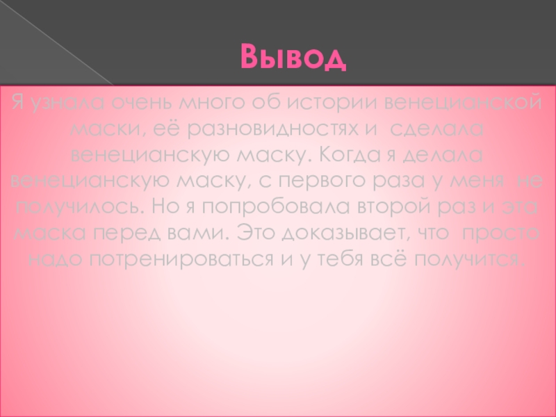 сделала венецианскую маску. Когда я делала венецианскую маску, с первого раза у меня не получилось. Но я попробовала второй раз и эта маска перед вами. Это доказывает, что просто надо потренироваться и у тебя всё получится.