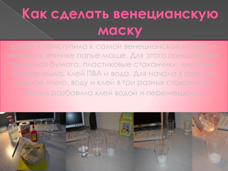именно к технике папье-маше. Для этого понадобится: туалетная бумага, пластиковые стаканчики, кисточки, жидкое мыло, клей ПВА и вода. Для начала я разлила жидкое мыло, воду и клей в три разных стаканчика. Затем разбавила клей водой и перемешала.