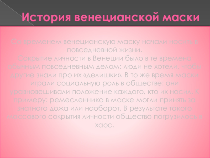 Сокрытие личности в Венеции было в те времена обычным повседневным делом: люди не хотели, чтобы другие знали про их «делишки». В то же время маски играли социальную роль в обществе: они уравновешивали положение каждого, кто их носил. К примеру: ремесленника в маске могли принять за знатного дожа или наоборот. В результате такого массового сокрытия личности общество погрузилось в хаос.