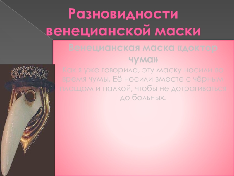 идя к больному, надевали маску с длинным клювом, на кончик которой капали эфирные масла , надеясь таким образом защититься от чумы. Позднее эту идею переняла аристократия и началась долгая история венецианской маски.