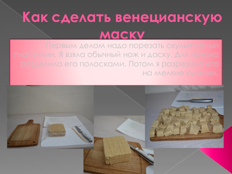 обычный нож и доску. Для начала разделила его полосками. Потом я разрезала его на мелкие кусочки.