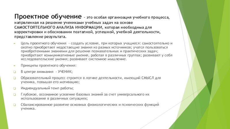 Цель проектного обучения - создать условия, при которых учащиеся: самостоятельно и охотно приобретают недостающие знания из разных источников; учатся пользоваться приобретенными знаниями для решения познавательных и практических задач; приобретают коммуникативные умения, работая в различных группах; развивают у себя исследовательские умения; развивают системное мышление.
