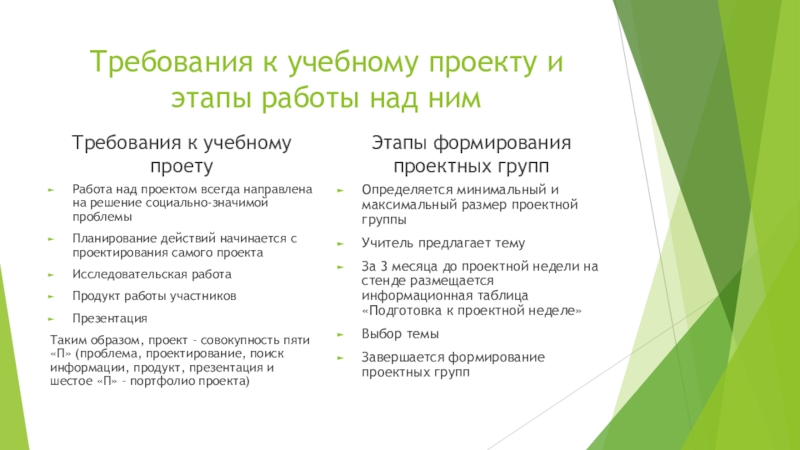 Таким образом, проект – совокупность пяти «П» (проблема, проектирование, поиск информации, продукт, презентация и шестое «П» – портфолио проекта)