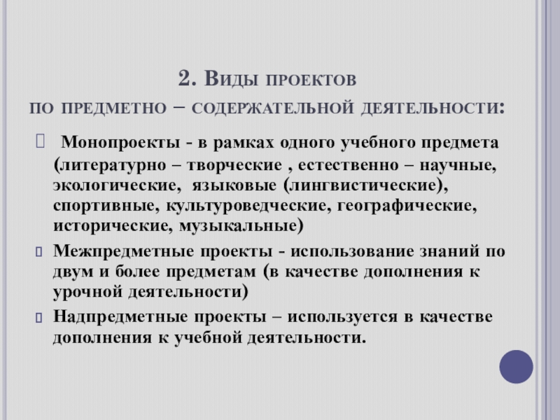 Надпредметные проекты – используется в качестве дополнения к учебной деятельности.