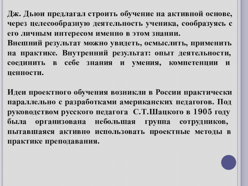Слайд 5Дж. Дьюи предлагал строить обучение на активной основе, через целесообразную деятельность