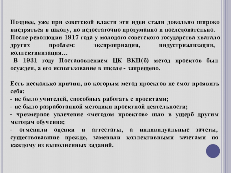 В 1931 году Постановлением ЦК ВКП(б) метод проектов был осужден, а его использование в школе - запрещено.