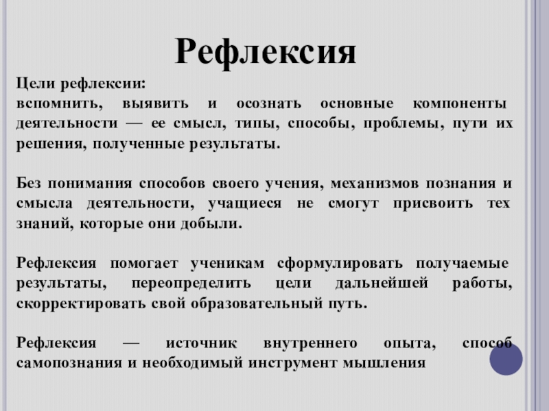 Рефлексия помогает ученикам сформулировать получаемые результаты, переопределить цели дальнейшей работы, скорректировать свой образовательный путь.