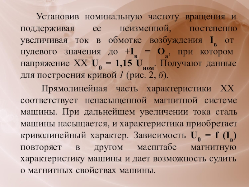 Прямолинейная часть характеристики ХХ соответствует ненасыщенной магнитной системе машины. При дальнейшем увеличении тока сталь машины насыщается, и характеристика приобретает криволинейный характер. Зависимость U0 = f (Iв) повторяет в другом масштабе магнитную характеристику машины и дает возможность судить о магнитных свойствах машины.
