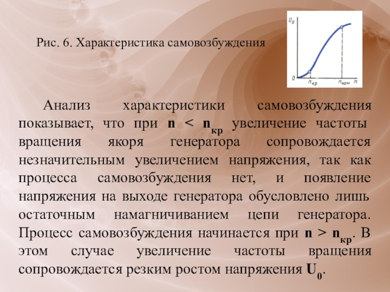 показывает, что при n < nкр увеличение частоты вращения якоря генератора сопровождается незначительным увеличением напряжения, так как процесса самовозбуждения нет, и появление напряжения на выходе генератора обусловлено лишь остаточным намагничиванием цепи генератора. Процесс самовозбуждения начинается при n > nкр. В этом случае увеличение частоты вращения сопровождается резким ростом напряжения U0.