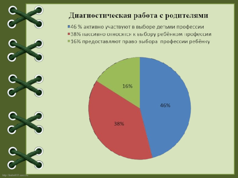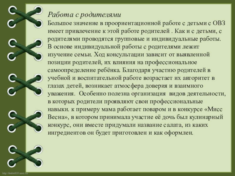 имеет привлечение к этой работе родителей . Как и с детьми, с родителями проводятся групповые и индивидуальные работы. В основе индивидуальной работы с родителями лежит изучение семьи. Ход консультации зависит от выявленной позиции родителей, их влияния на профессиональное самоопределение ребёнка. Благодаря участию родителей в учебной и воспитательной работе возрастает их авторитет в глазах детей, возникает атмосфера доверия и взаимного уважения. Особенно полезна организация видов деятельности, в которых родители проявляют свои профессиональные навыки. к примеру мама работает поваром и в конкурсе «Мисс Весна», в котором принимала участие её дочь был кулинарный конкурс, они вместе придумали название салата, из каких ингредиентов он будет приготовлен и как оформлен.