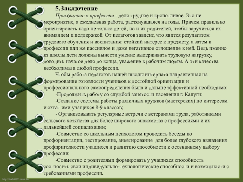 ежедневная работа, растянувшаяся на годы. Причем правильно ориентировать надо не только детей, но и их родителей, чтобы заручиться их вниманием и поддержкой. От педагогов зависит, что явится результатом трудового обучения и воспитания: стойкий интерес к предмету, а затем к профессии или же пассивное и даже негативное отношение к ней. Ведь именно из школы дети должны вынести умение выдерживать трудовую нагрузку, доводить начатое дело до конца, уважение к рабочим людям. А эти качества необходимы в любой профессии.