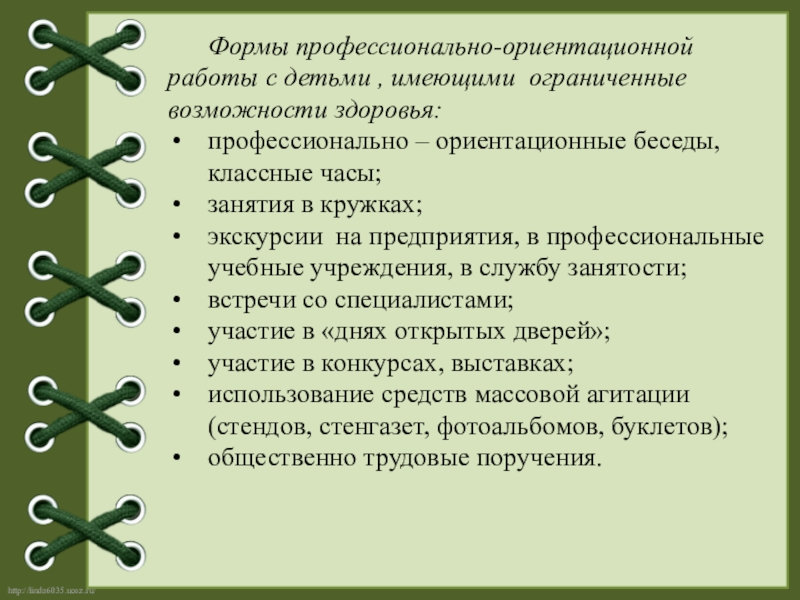Слайд 9Формы профессионально-ориентационной работы с детьми , имеющими ограниченные возможности здоровья: