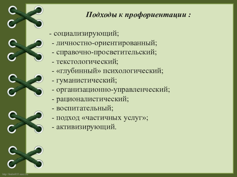 3.Формирующий- развитие установок и мотиваций к рекомендуемым с медицинской точки зрения видам трудовой деятельности, развитие качеств, имеющих важное значение для успешности в показанных видах деятельности, сглаживание и ликвидация неадекватных установок на освоение не рекомендованных с психологической и/или медицинской точки зрения профессий и специальностей , содействие в осуществлении адекватного профессионального выбора.
