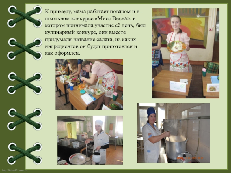 Слайд 26К примеру, мама работает поваром и в школьном конкурсе «Мисс Весна»,