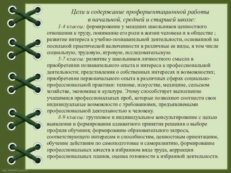 1.Предварительный- формирование установок на труд и позитивное отношение к труду, формирование базовых ценностей, норм и правил профессионального поведения, формирование адекватной самоидентификации, самооценки относительно выбираемой профессии с учетом медицинских показаний и противопоказаний в отношении предварительно сделанному профессиональному выбору.