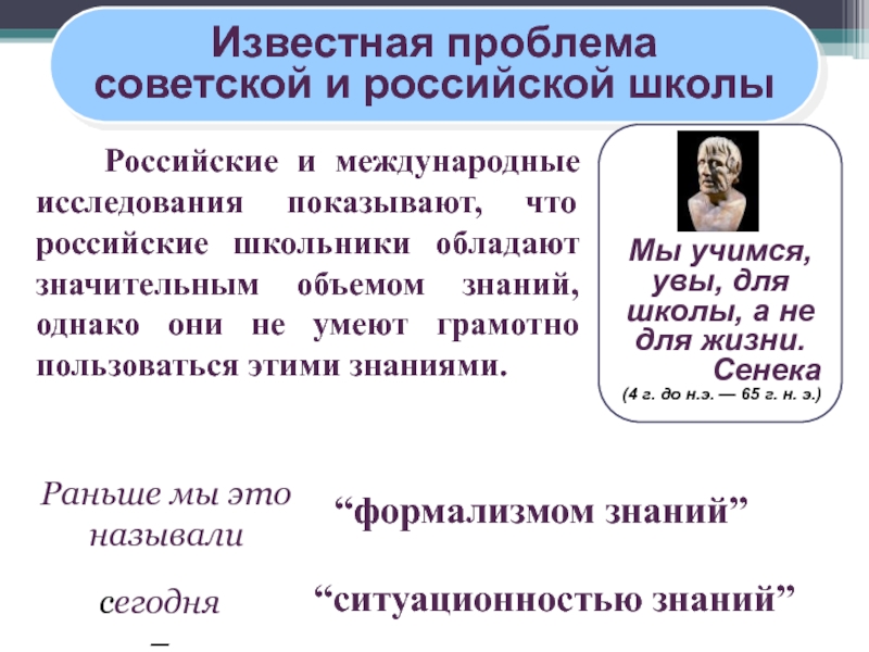 Российские и международные исследования показывают, что российские школьники обладают значительным объемом знаний, однако они не умеют грамотно пользоваться этими знаниями.