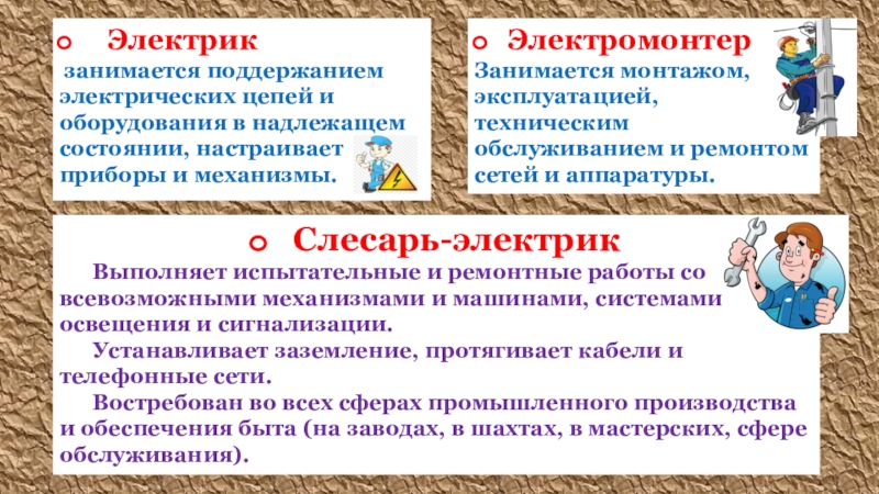 Выполняет испытательные и ремонтные работы со всевозможными механизмами и машинами, системами освещения и сигнализации.