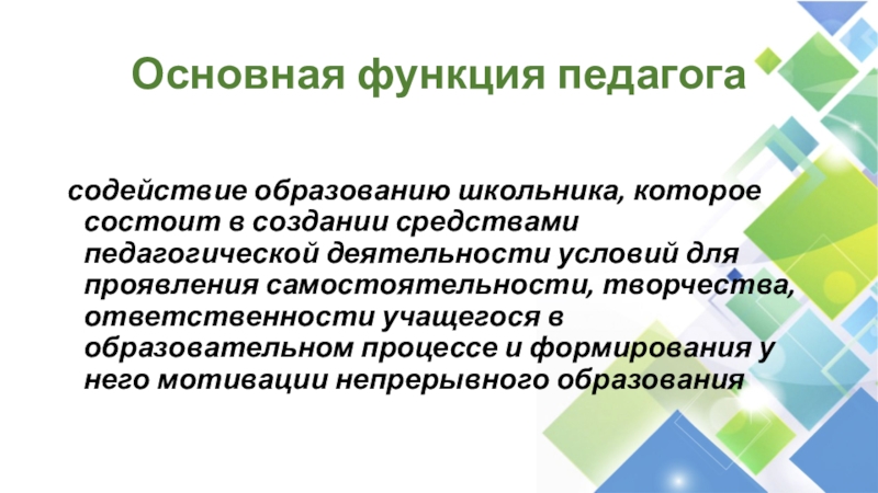 Основная функция педагогасодействие образованию школьника, которое состоит в создании средствами педагогической деятельности условий для проявления самостоятельности, творчества,