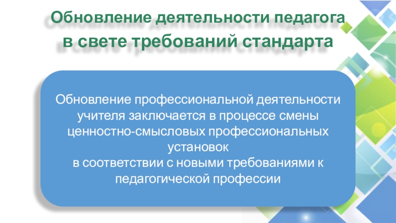Обновление деятельности педагога в свете требований стандартаОбновление профессиональной деятельности учителя заключается в процессе смены ценностно-смысловых профессиональных установок