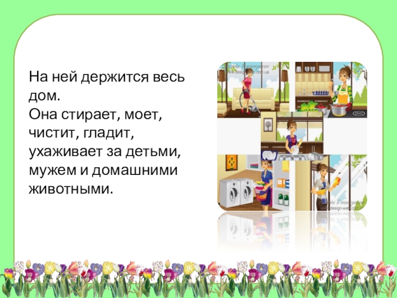 На ней держится весь дом.Она стирает, моет, чистит, гладит, ухаживает за детьми, мужем и домашними животными.