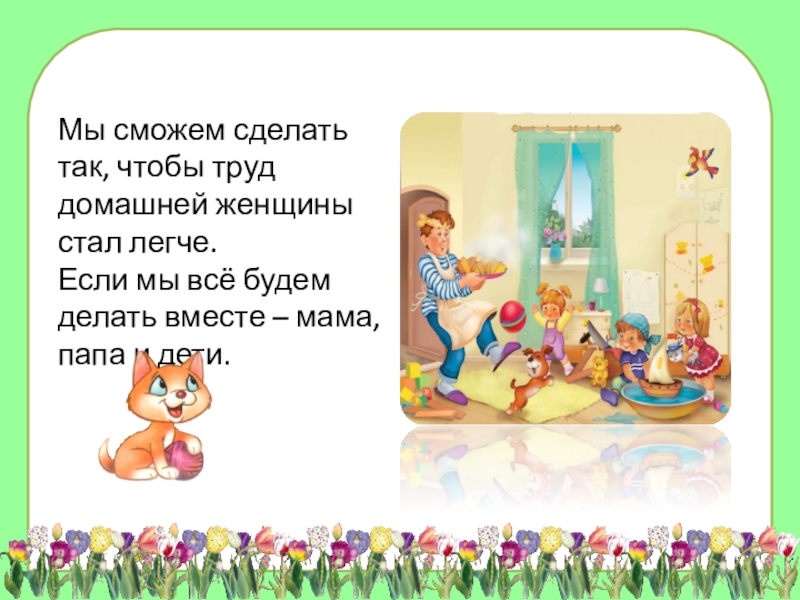Мы сможем сделать так, чтобы труд домашней женщины стал легче.Если мы всё будем делать вместе – мама,