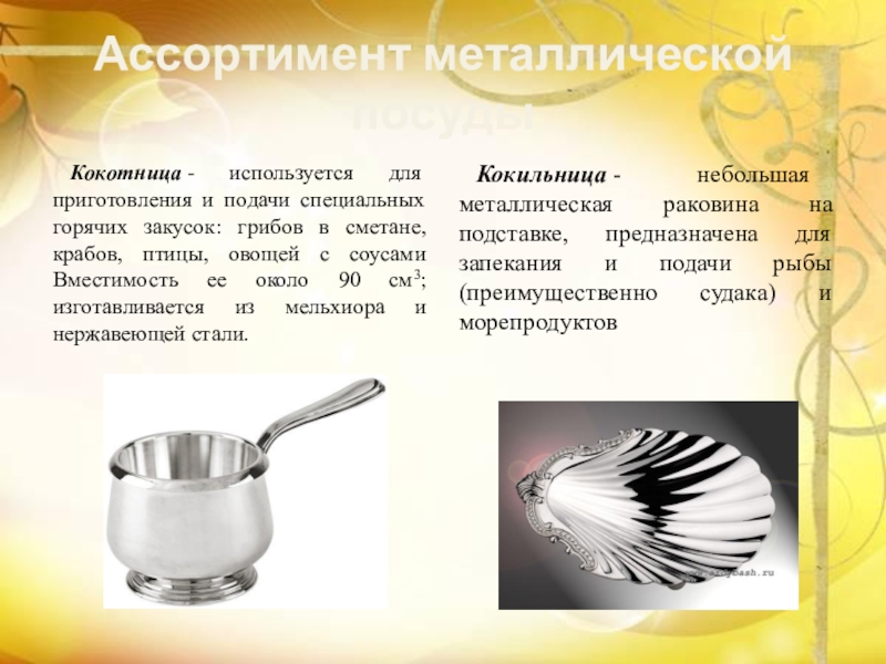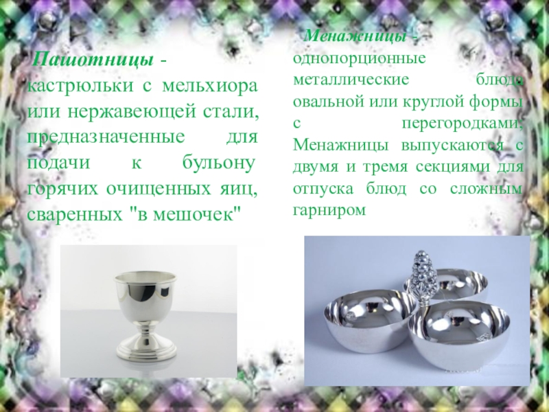 Слайд 23Пашотницы - кастрюльки с мельхиора или нержавеющей стали, предназначенные для подачи к