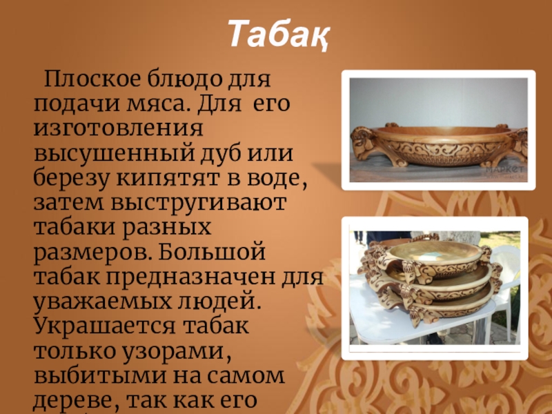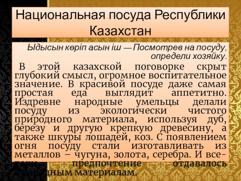 В этой казахской поговорке скрыт глубокий смысл, огромное воспитательное значение. В красивой посуде даже самая простая еда выглядит аппетитно. Издревне народные умельцы делали посуду из экологически чистого природного материала, используя дуб, березу и другую крепкую древесину, а также шкуры лошадей, коз. С появлением огня посуду стали изготавливать из металлов – чугуна, золота, серебра. И все-таки, предпочтение отдавалось природным материалам.