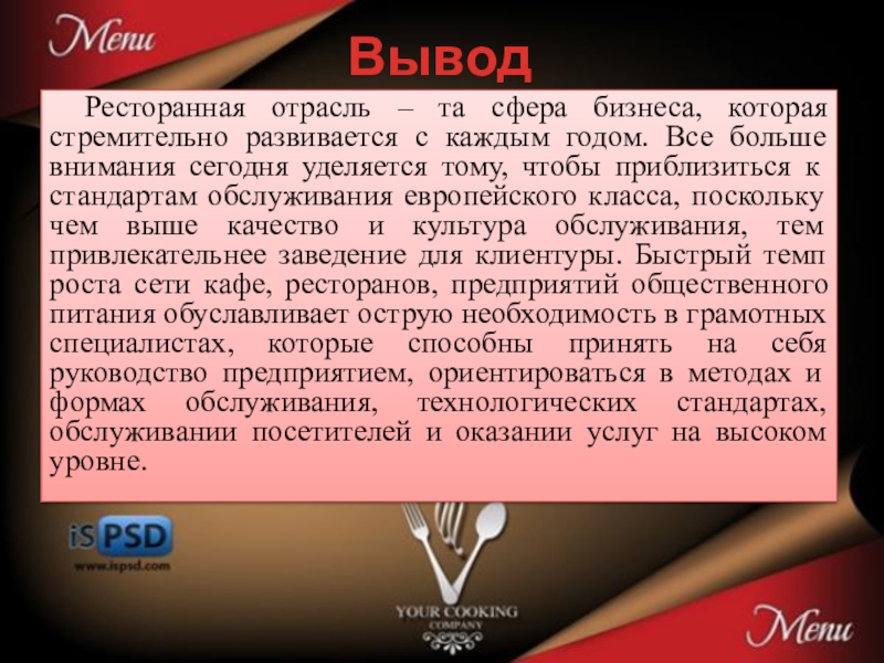 годом. Все больше внимания сегодня уделяется тому, чтобы приблизиться к стандартам обслуживания европейского класса, поскольку чем выше качество и культура обслуживания, тем привлекательнее заведение для клиентуры. Быстрый темп роста сети кафе, ресторанов, предприятий общественного питания обуславливает острую необходимость в грамотных специалистах, которые способны принять на себя руководство предприятием, ориентироваться в методах и формах обслуживания, технологических стандартах, обслуживании посетителей и оказании услуг на высоком уровне.