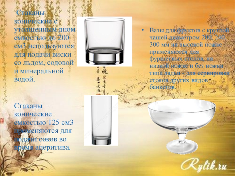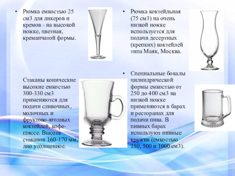Стаканы конические высокие емкостью 300-330 см3 применяются для подачи сливочных, молочных и фруктово-ягодных коктейлей, кофе-гляссе. Высота стаканов 160-170 мм, дно утолщенное.