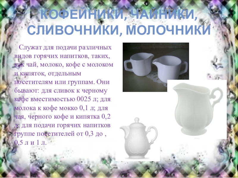 как чай, молоко, кофе с молоком и кипяток, отдельным посетителям или группам. Они бывают: для сливок к черному кофе вместимостью 0025 л; для молока к кофе мокко 0,1 л; для чая, черного кофе и кипятка 0,2 л; для подачи горячих напитков группе посетителей от 0,3 до , 0,5 л и 1 л.