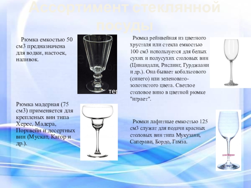 Рюмки лафитные емкостью 125 см3 служат для подачи красных столовых вин типа Мукузани, Саперави, Бордо, Гамза.