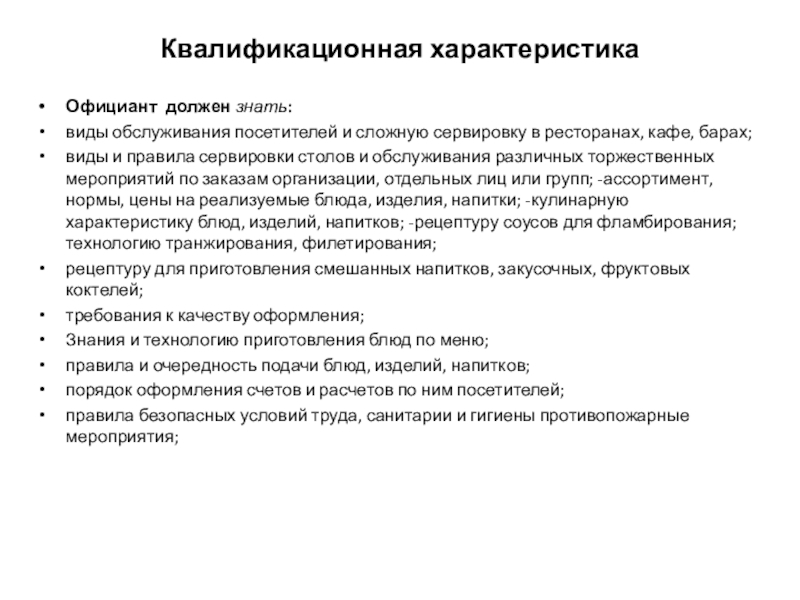 виды и правила сервировки столов и обслуживания различных торжественных мероприятий по заказам организации, отдельных лиц или групп; -ассортимент, нормы, цены на реализуемые блюда, изделия, напитки; -кулинарную характеристику блюд, изделий, напитков; -рецептуру соусов для фламбирования; технологию транжирования, филетирования;