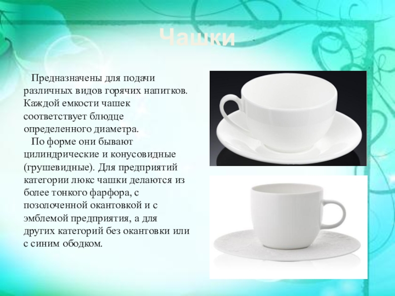 По форме они бывают цилиндрические и конусовидные (грушевидные). Для предприятий категории люкс чашки делаются из более тонкого фарфора, с позолоченной окантовкой и с эмблемой предприятия, а для других категорий без окантовки или с синим ободком.