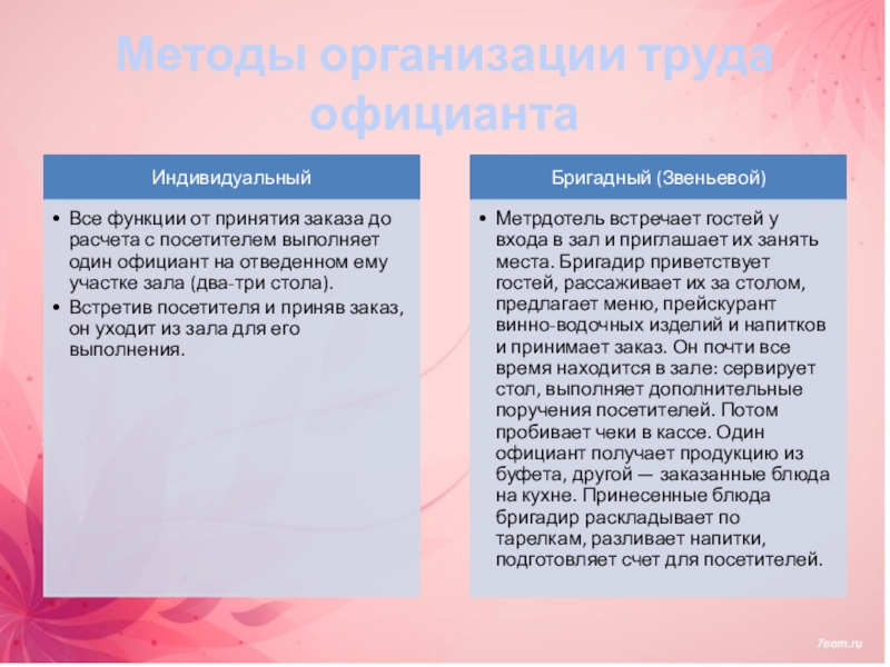 подготавливать зал и формировать столы для отдельных посетителей, официальных приёмов, банкетов с полным обслуживанием;