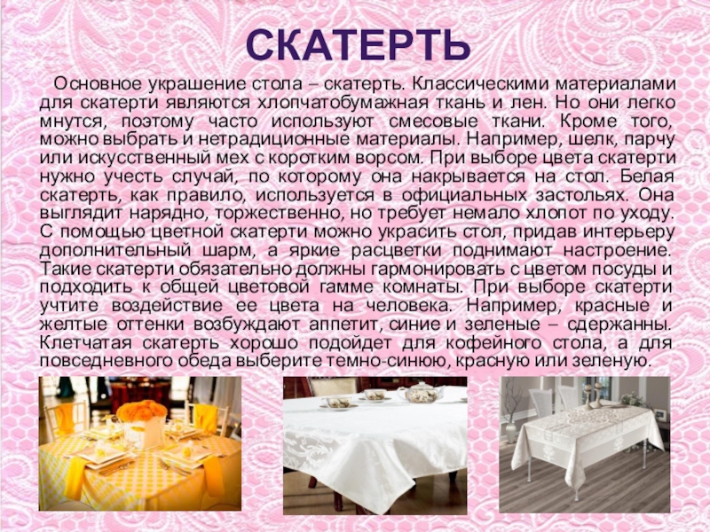 ткань и лен. Но они легко мнутся, поэтому часто используют смесовые ткани. Кроме того, можно выбрать и нетрадиционные материалы. Например, шелк, парчу или искусственный мех с коротким ворсом. При выборе цвета скатерти нужно учесть случай, по которому она накрывается на стол. Белая скатерть, как правило, используется в официальных застольях. Она выглядит нарядно, торжественно, но требует немало хлопот по уходу. С помощью цветной скатерти можно украсить стол, придав интерьеру дополнительный шарм, а яркие расцветки поднимают настроение. Такие скатерти обязательно должны гармонировать с цветом посуды и подходить к общей цветовой гамме комнаты. При выборе скатерти учтите воздействие ее цвета на человека. Например, красные и желтые оттенки возбуждают аппетит, синие и зеленые – сдержанны. Клетчатая скатерть хорошо подойдет для кофейного стола, а для повседневного обеда выберите темно-синюю, красную или зеленую.