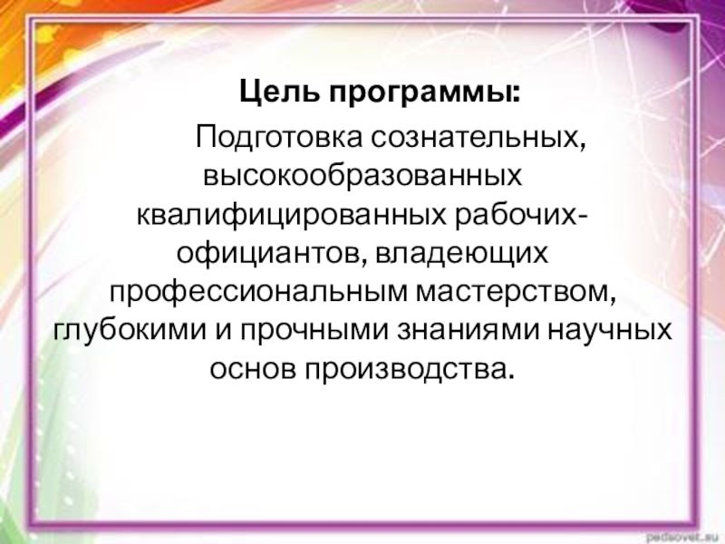 Подготовка сознательных, высокообразованных квалифицированных рабочих-официантов, владеющих профессиональным