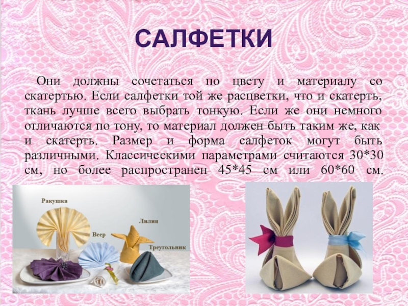 той же расцветки, что и скатерть, ткань лучше всего выбрать тонкую. Если же они немного отличаются по тону, то материал должен быть таким же, как и скатерть. Размер и форма салфеток могут быть различными. Классическими параметрами считаются 30*30 см, но более распространен 45*45 см или 60*60 см.