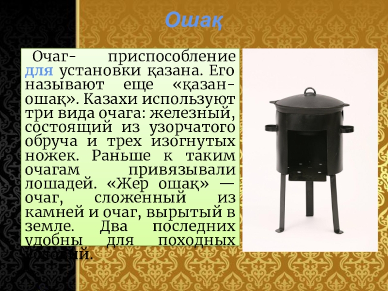 Очаг- приспособление для установки қазана. Его называют еще «қазан-ошақ». Казахи используют