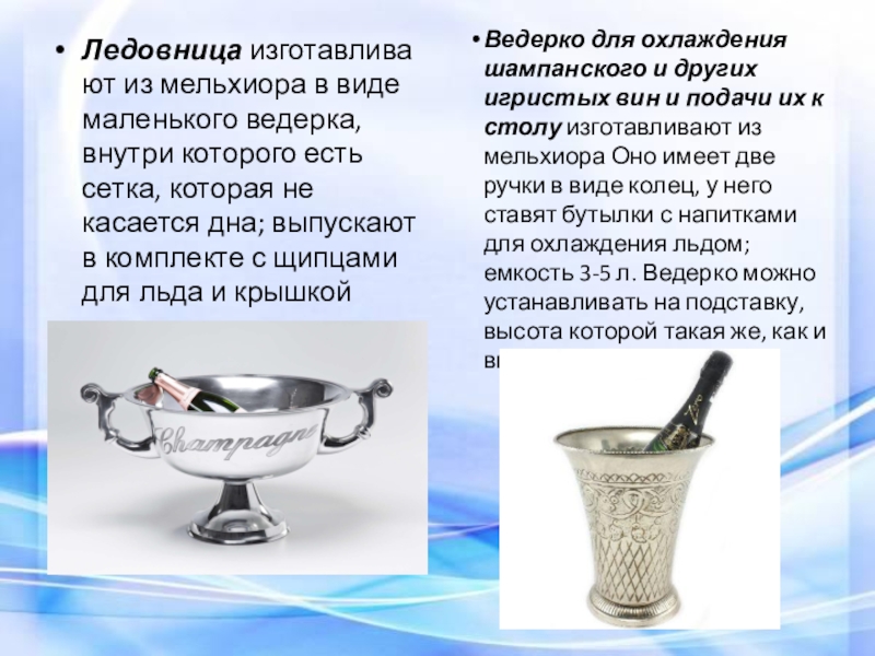 Слайд 24Ледовница изготавливают из мельхиора в виде маленького ведерка, внутри которого есть сетка,